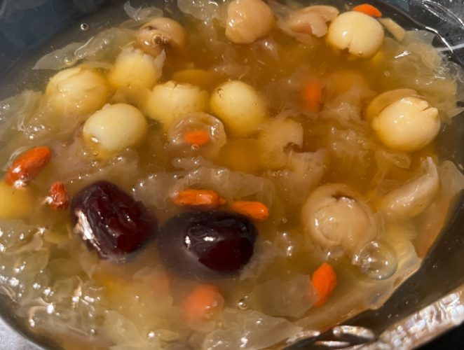 - 後放糖和配料: 千萬不要一開始就加糖! 糖會讓白木耳不容易煮爛、出膠。要在白木耳已經煮到軟糯、湯汁開始變稠之後(大約最後15-30分鐘),再加入冰糖、紅棗、枸杞、蓮子等配料。如果是加新鮮水果塊(像梨子、蘋果),更要最後幾分鐘才放,免得煮到糊爛沒口感。這點超重要,我初期常犯的錯誤!